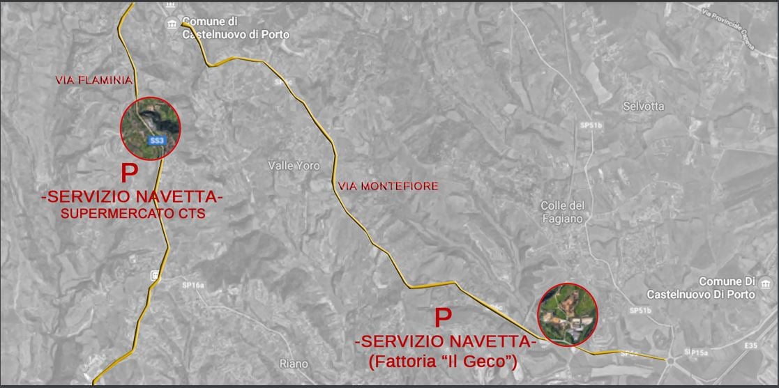 Per l’occasione è stato attivato un servizio navetta nel week end, con partenza da via Flaminia, presso il parcheggio del supermercato CTS, e da via Montefiore presso il parcheggio della fattoria ‘Il Geco’, avente come punto di arrivo il campo sportivo di via Montefiore, con i seguenti orari: