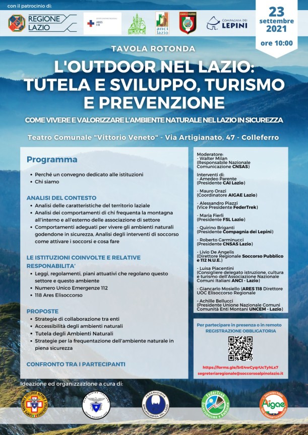 L’evento, patrocinato da Anci Lazio, Regione Lazio Uncem Lazio, della Comunità dei Monti Lepini e Comune di Colleferro e della Compagnia dei Lepini, è organizzato dal Servizio Regionale Lazio del Corpo Nazionale del Soccorso Alpino e Speleologico (CNSAS), in collaborazione con il Club Alpino Italiano Lazio (CAI Lazio), FederTrek, la Federazione Speleologica Laziale (FSL), l’Associazione Italiana Guide Ambientali Escursionistiche (AIGAE).