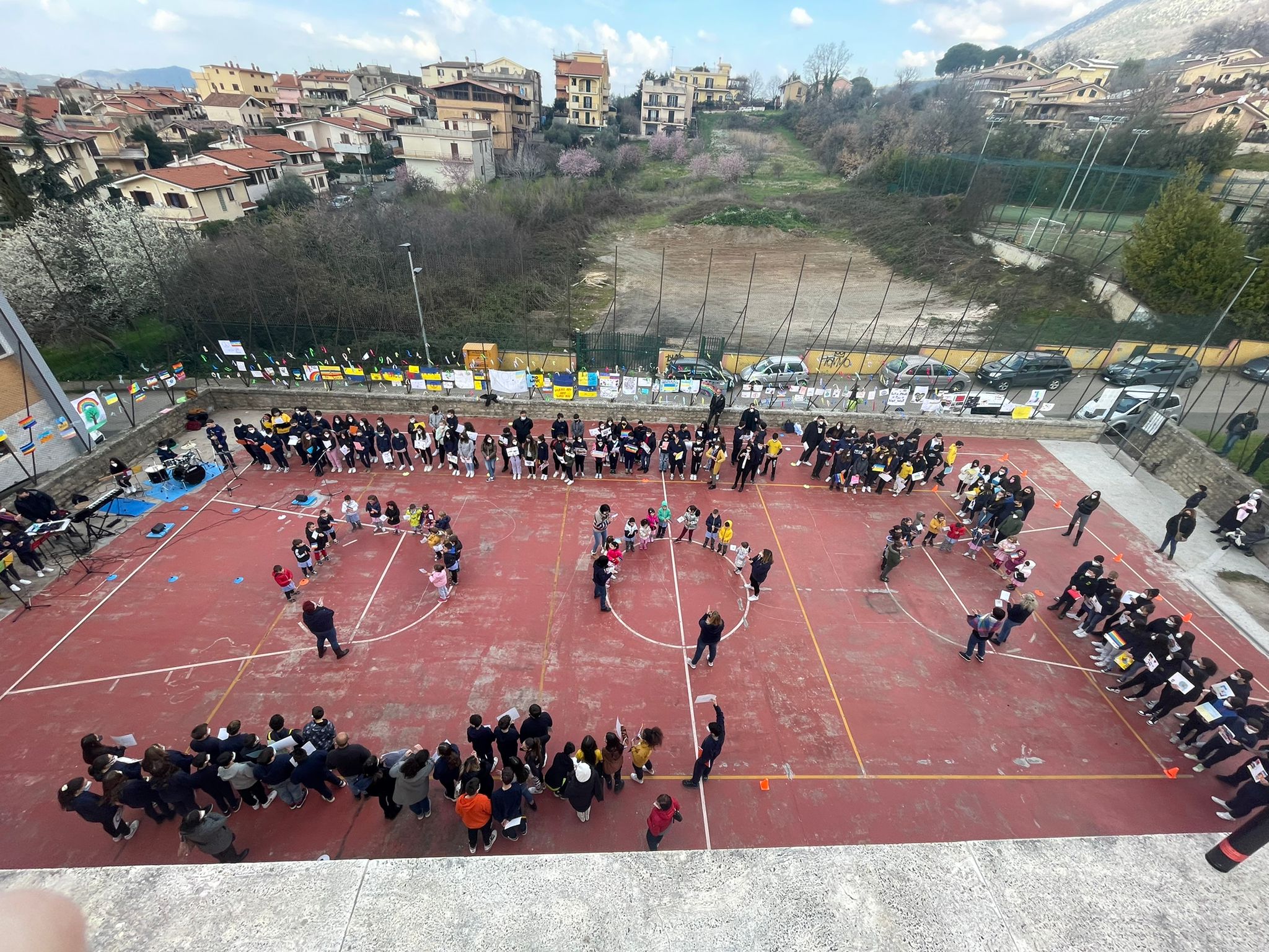 “Ogni bambino della terra vuole la pace e non la guerra”. Flashmob degli alunni della scuola dell’infanzia, primaria e media, ieri, 11 marzo, a Marcellina. Canti, letture di poesie, musica, esposizione di lavori fatti in classe nel campo sportivo. Presente il sindaco Alessandro Lundini, la vicesindaca Alessandra Danieli e la dirigente scolastica Angela Bianchi, orgogliosa, della riuscita della manifestazione.