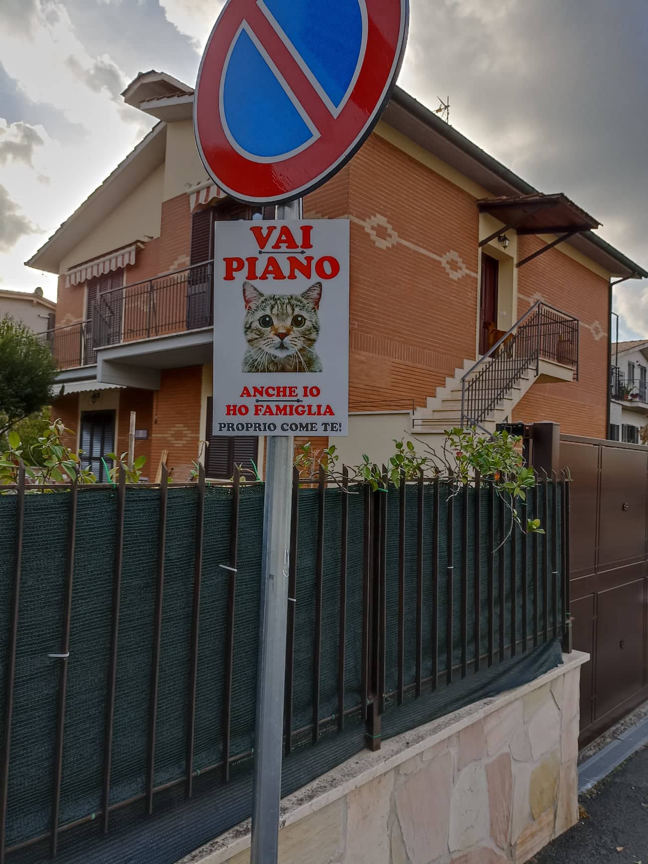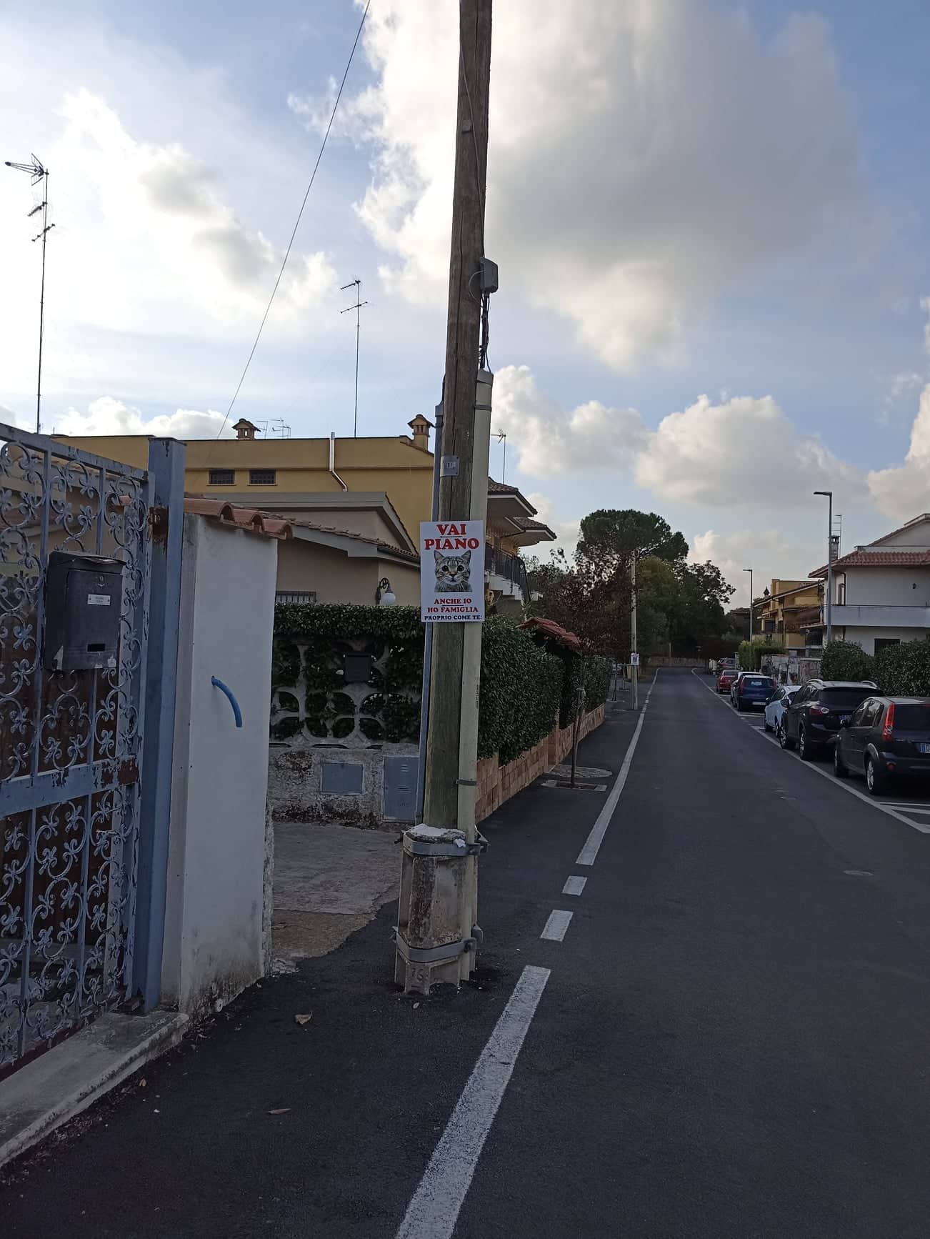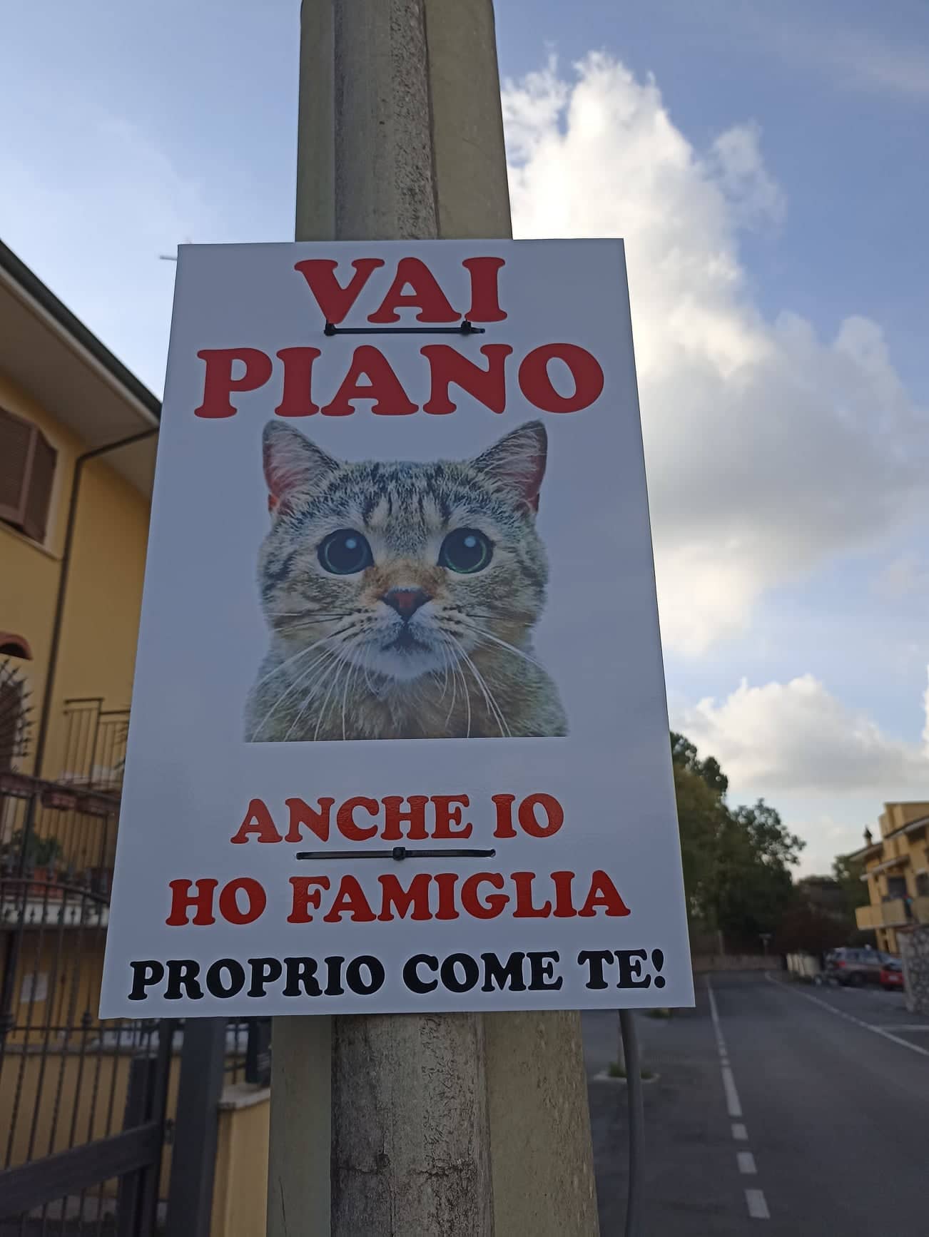 L’artista, per evitare nuove tragedie, allora ha appeso con l’aiuto di altri abitanti dei cartelli col muso di gatti e una scritta: “Vai piano. Anche io ho famiglia. Proprio come te”.