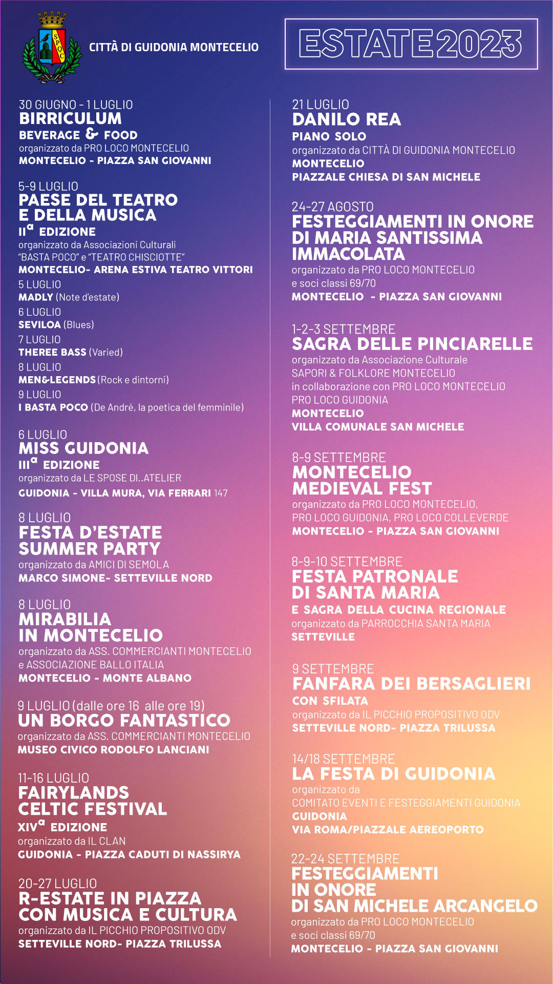“Abbiamo riunito in un unico programma gli eventi organizzati dalle associazioni di Guidonia Montecelio – spiega l’assessore alla Cultura Michela Pauselli – e che animeranno, insieme al concerto di Danilo Rea organizzato dall’Amministrazione comunale, l’estate della nostra Città. Non posso che essere felice, inoltre, per il ritorno di due appuntamenti importanti come il Fairylands e le Pinciarelle, che peraltro si svolgeranno nella loro location originale all’interno del giardino del San Michele. Questi due eventi richiamavano migliaia di persone da tutta Italia ed erano due delle manifestazioni più rappresentative di Guidonia Montecelio. Era nostro dovere supportare gli organizzatori per farle tornare”.