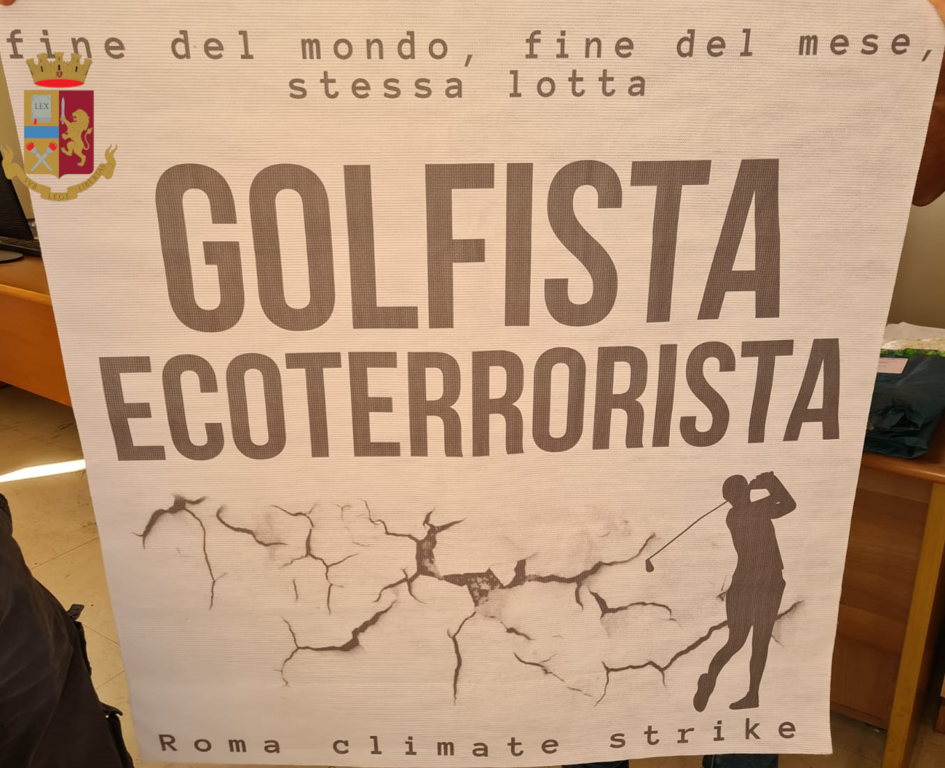 Sono stati anche rinvenuti degli striscioni riportanti frasi di contestazione al golf. Del tipo “Golfista ecoterrorista”, e “Il vostro lusso ci lascia a secco”.
